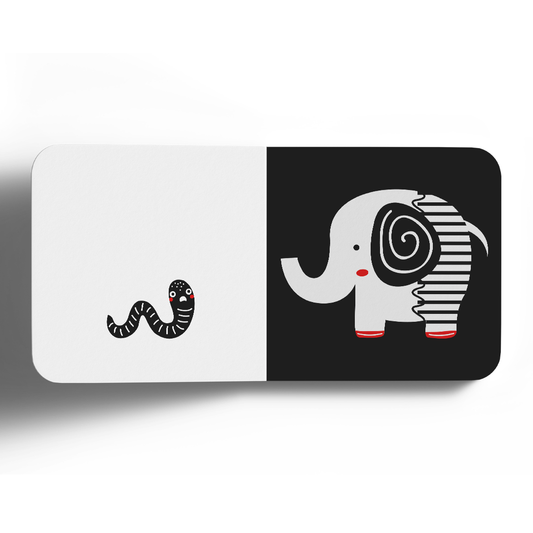 تمَّ اختيار رسومات عالية التباين باللّون الأبيض والأسود، بالإضافة لتفاصيل محددة تمَّ تصميمها باللون الأحمر لتناسب الأطفال الأكبر عمراً.